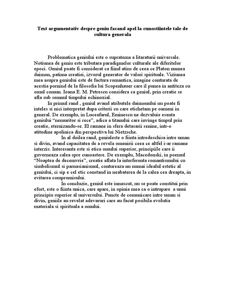 Text Argumentativ Despre Geniu Facand Apel La Cunostiintele Tale De Cultura Generala