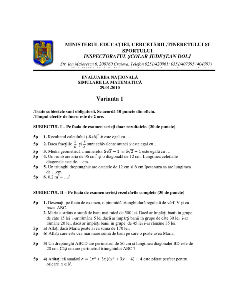 Mate Info Ro 984 Evaluarea Nationala Simulare La Matematica 29 01 2010 Dolj